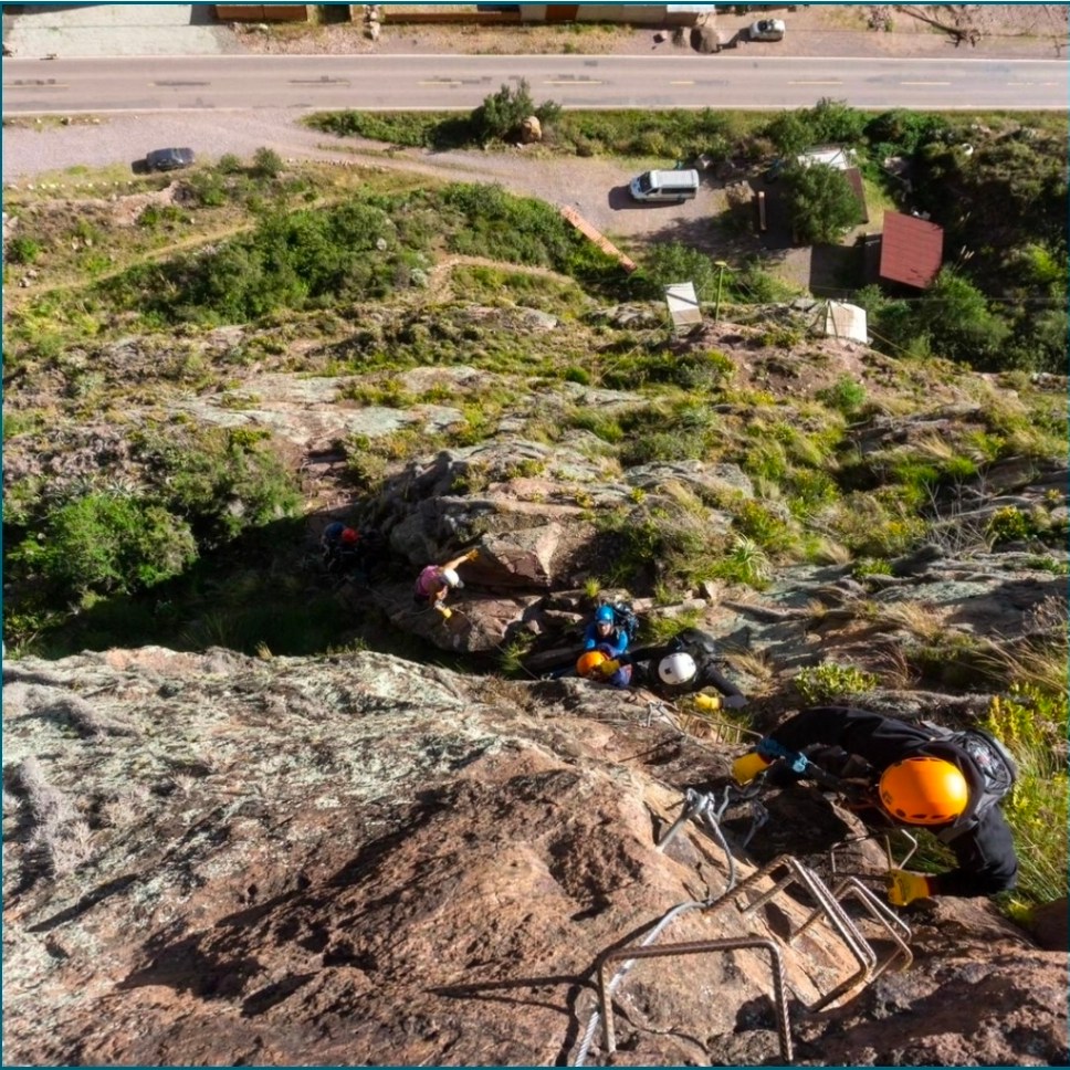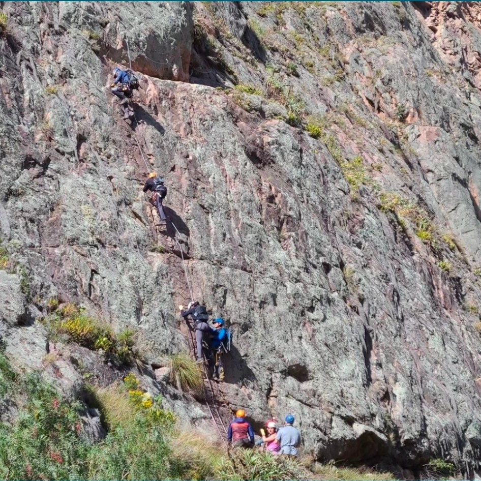 A via ferreta is like a cross between rock climbing and hiking. It’s a protected climbing route that includes ladders or steel fixtures. You always wear a helmet, a harness, and a carabiner. The carabiner is connected to your harness and the steel fixtures at all times.