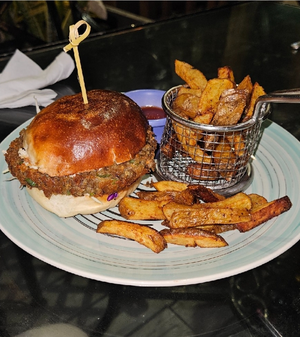One night for Dinner I walked to Mangoz Restaurant and Bar, which is also in Villa, St. Vincent. It was only a six minute walk from the Beachcombers Hotel. I checked their menu before being seated and was so excited to see a lentil burger. The lentil burger came with French fries, I also ordered a wild berry smoothie. It was refreshing to eat the lentil burger because I was really craving a burger.